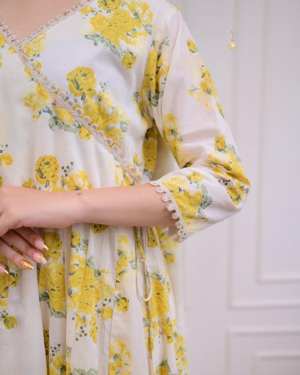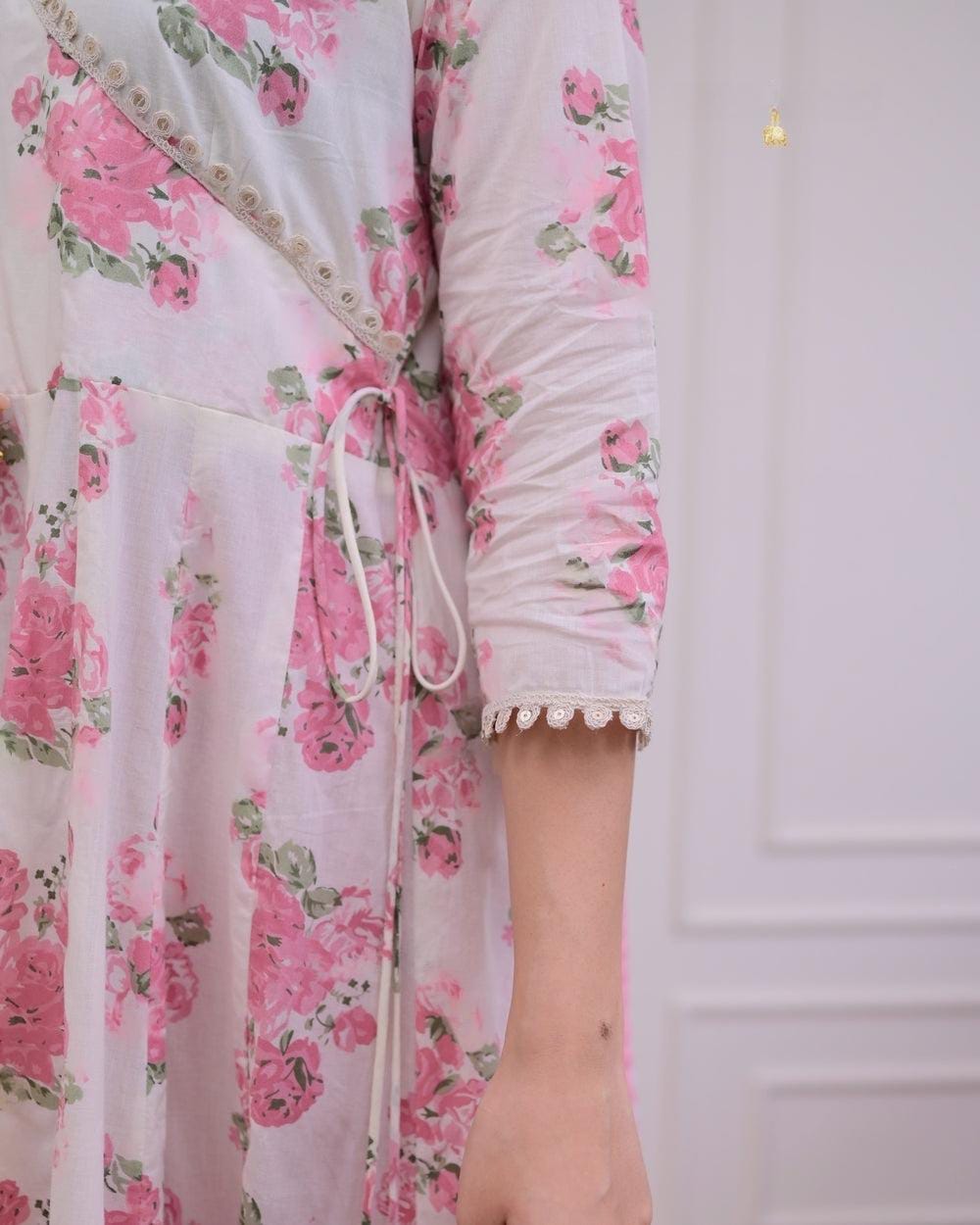 Step into effortless grace with our Elegant Cotton Angrakha-Style Kurti Pant Set, crafted for the modern woman who cherishes tradition. Designed in a flattering Angrakha silhouette, this ensemble features delicate floral prints and intricate embroidery, offering a perfect blend of charm and sophistication.